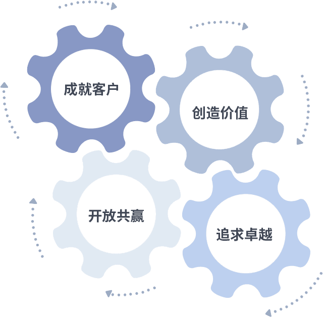 成就客户是一切决策的出发点,,,创造价值是衡量所有工作的标准,,,,追求卓越是我们做事做人的态度,,,,开放共赢是我们的格局也是最终的结果。。。价值观的齿轮环环相扣,,推动着组织里的每个人不断向前。。