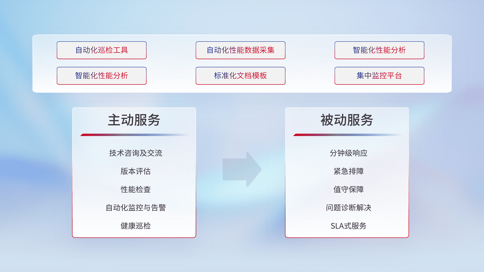 智能化工具和标准化文档,,,保障服务质量,,,,提供主动服务(包含技术咨询、、、、版本评估、、、、性能检查、、、自动化监控与告警、、、、健康巡检)和被动服务包含(分钟级响应、、、紧急排障、、、值守保障、、问题诊断解决、、、、SLA服务)。。。